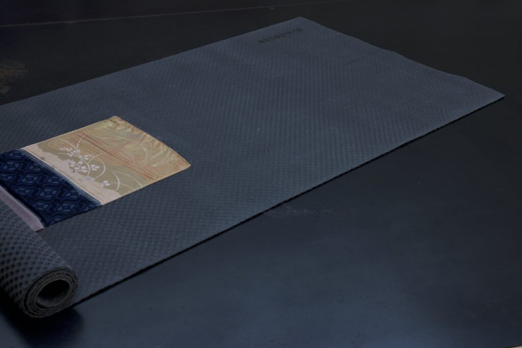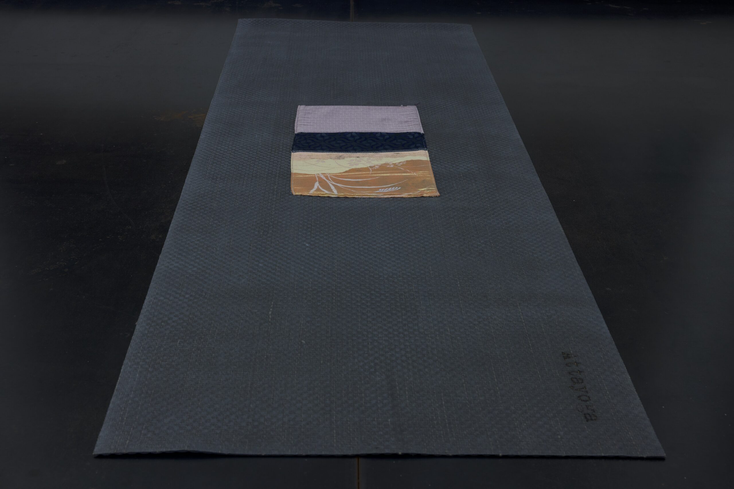 Mariage de 3 bandes de tissus provenant de obis japonais vintage en soie rapportés de Tokyo et cousus sur notre souche bio mélange de jute et de caoutchouc naturel.