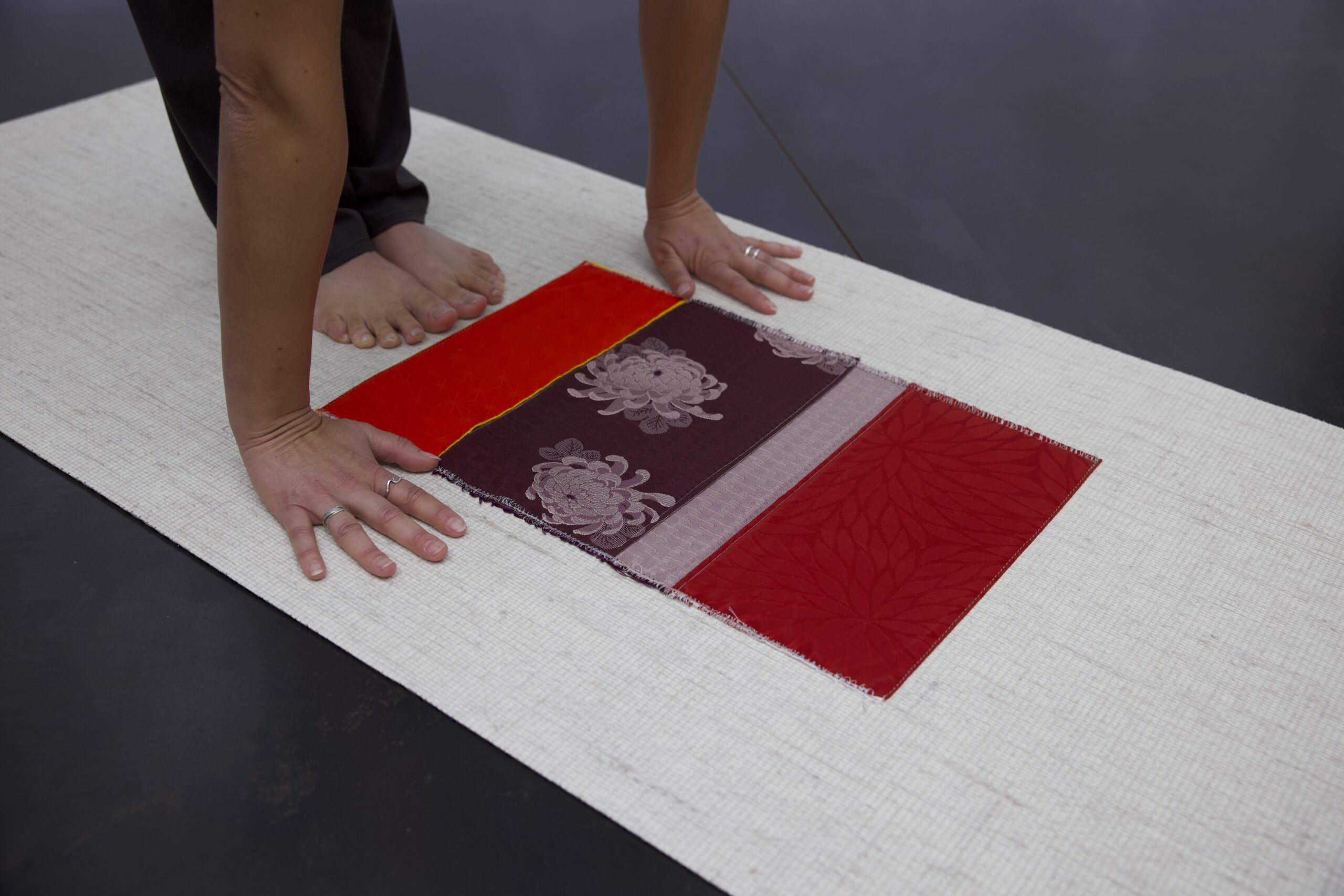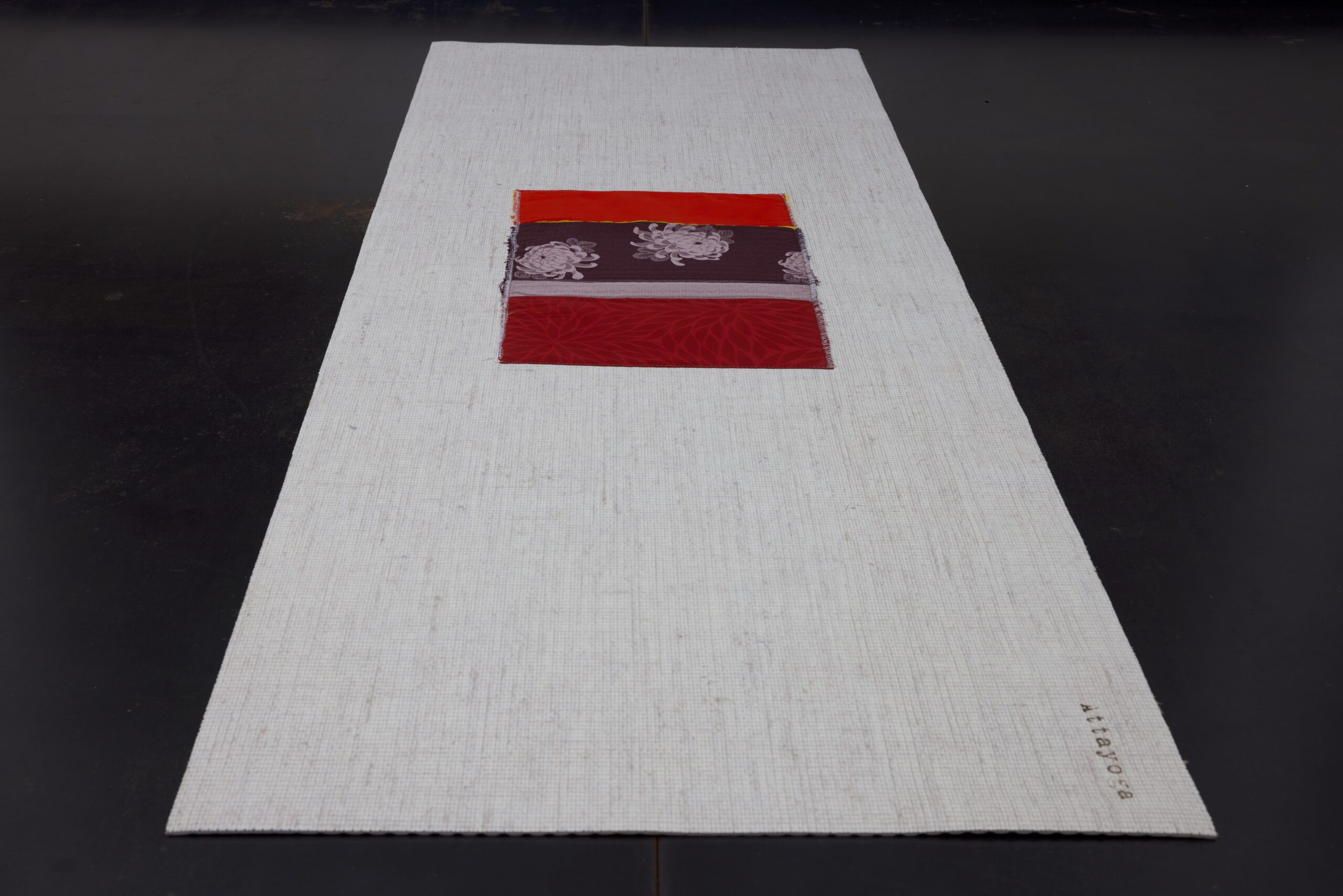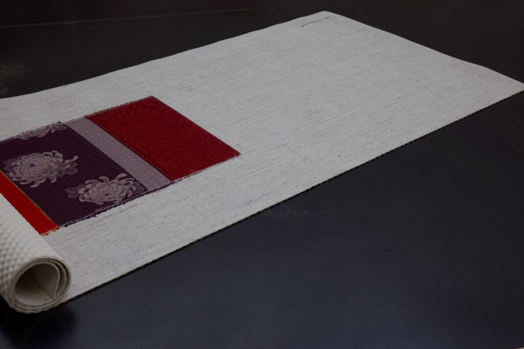 Mariage de 3 bandes de tissus provenant de obis japonais vintage en soie rapportés de Tokyo et cousus sur notre souche bio mélange de jute et de caoutchouc naturel.
